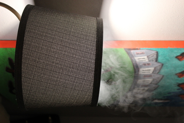 I SEE A LAMPSHADE THAT HAS SMOKE COMING OUT OF IT.