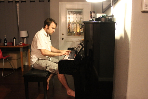 A man wearing a white shirt and khaki shorts is playing a black piano.