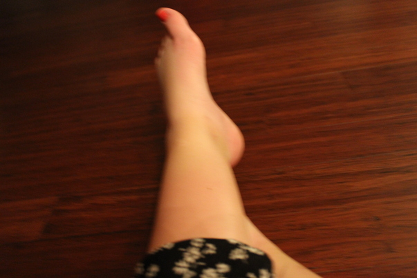 A human leg with flower print shorts at it's top half.