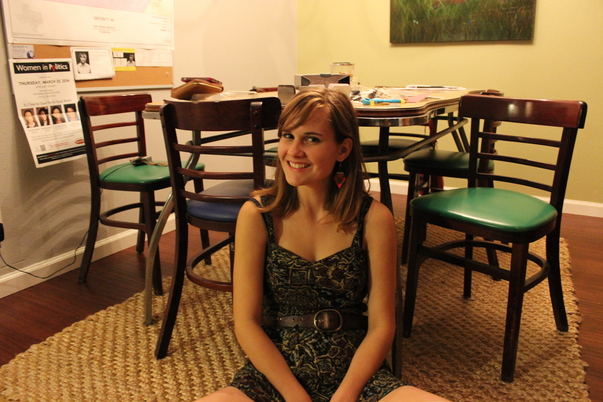 A woman is sitting in front of blue and green wooden chairs and a cluttered table.