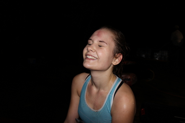 A young woman smiles despite the bump on her head.
