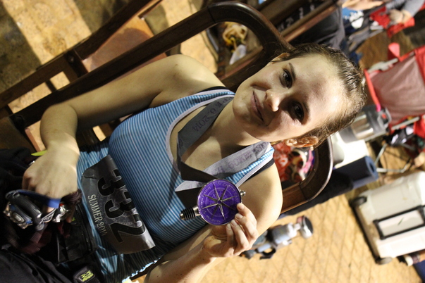 A girl wearing a number bib from a race holds up a purple and black medal.