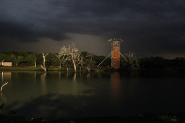 There is some kind of tower like structure standing on the other side of the pond.