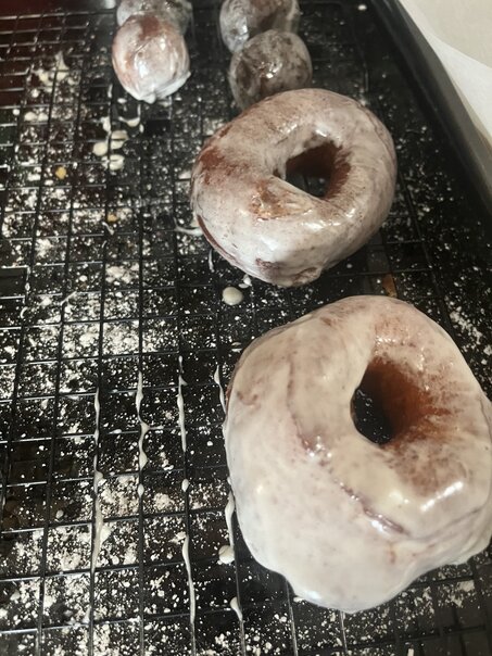 As soon as the movie ended, I got to working on this. We made a full set of regular glazed donuts. These were made with yeast and so they had the typical rising process I'd expect any other kind of bread to undergo. I did burn my finger in the deep fry oil, but it wasn't too bad.