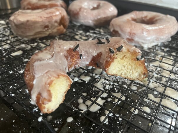 As soon as the movie ended, I got to working on this. We made a full set of regular glazed donuts. These were made with yeast and so they had the typical rising process I'd expect any other kind of bread to undergo. I did burn my finger in the deep fry oil, but it wasn't too bad.