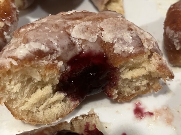 As soon as the movie ended, I got to working on this. We made a full set of regular glazed donuts. These were made with yeast and so they had the typical rising process I'd expect any other kind of bread to undergo. I did burn my finger in the deep fry oil, but it wasn't too bad.