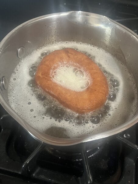 As soon as the movie ended, I got to working on this. We made a full set of regular glazed donuts. These were made with yeast and so they had the typical rising process I'd expect any other kind of bread to undergo. I did burn my finger in the deep fry oil, but it wasn't too bad.