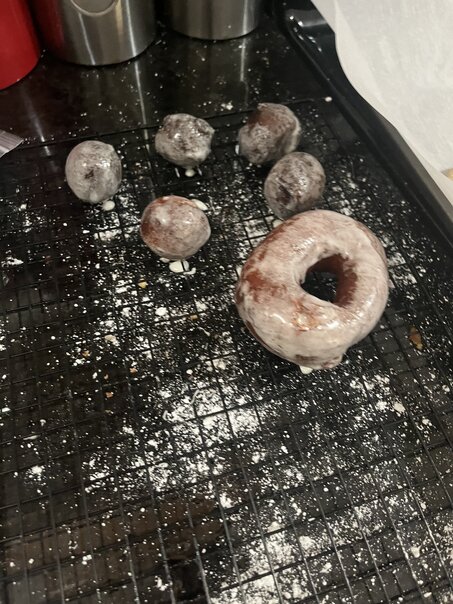 As soon as the movie ended, I got to working on this. We made a full set of regular glazed donuts. These were made with yeast and so they had the typical rising process I'd expect any other kind of bread to undergo. I did burn my finger in the deep fry oil, but it wasn't too bad.