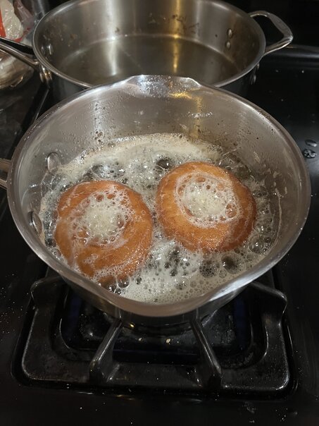 As soon as the movie ended, I got to working on this. We made a full set of regular glazed donuts. These were made with yeast and so they had the typical rising process I'd expect any other kind of bread to undergo. I did burn my finger in the deep fry oil, but it wasn't too bad.
