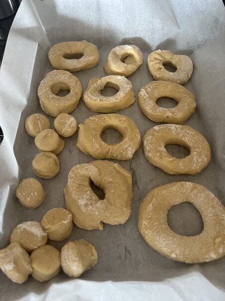 As soon as the movie ended, I got to working on this. We made a full set of regular glazed donuts. These were made with yeast and so they had the typical rising process I'd expect any other kind of bread to undergo. I did burn my finger in the deep fry oil, but it wasn't too bad.
