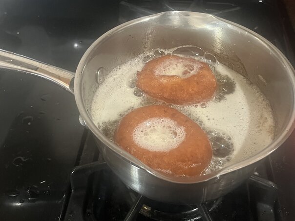 As soon as the movie ended, I got to working on this. We made a full set of regular glazed donuts. These were made with yeast and so they had the typical rising process I'd expect any other kind of bread to undergo. I did burn my finger in the deep fry oil, but it wasn't too bad.