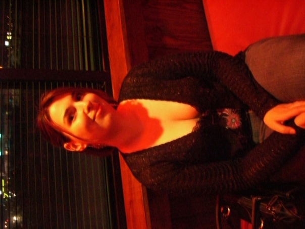 There is a woman smiling while sitting on a red bench, wearing a black, long sleeved shirt.