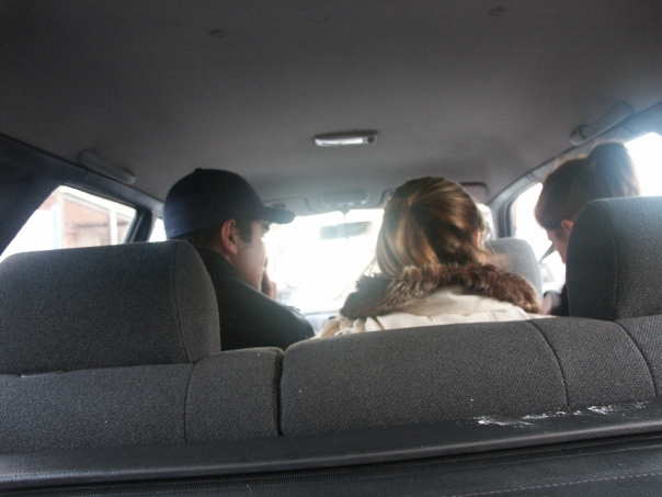 Three passengers in the backseat of a car studying something in front of the one of the passengers.