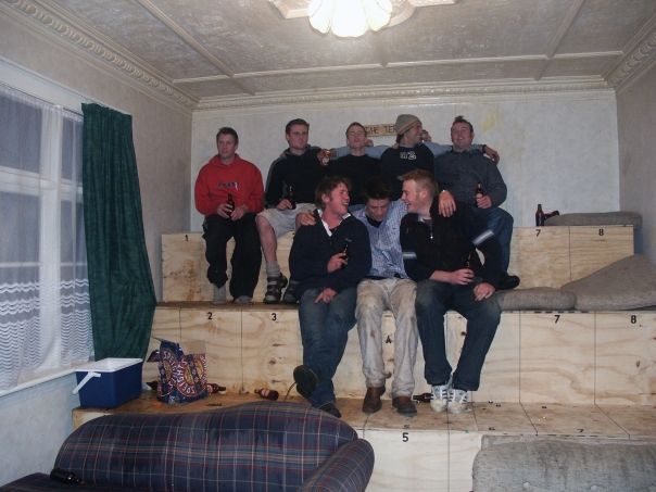 Eight guys sitting on a terrace in a flat drinking Speight's beer bottles.