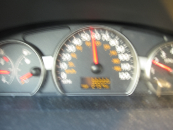 Dashboard of a vehicle showing a speed meter in the middle of two other meters.