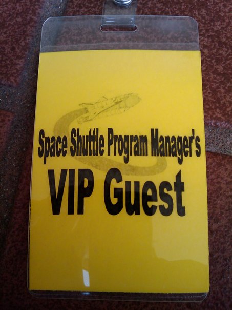 A space-program VIP badge with black letters and a yellow background sits on a nice red marble surface.