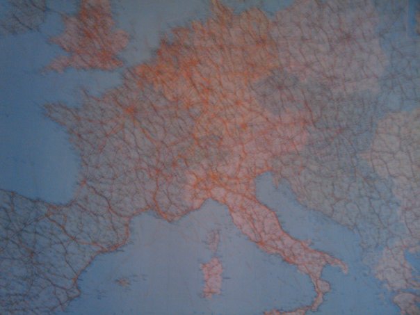 A flat, detailed map is covered with many fine red lines and blue water areas.