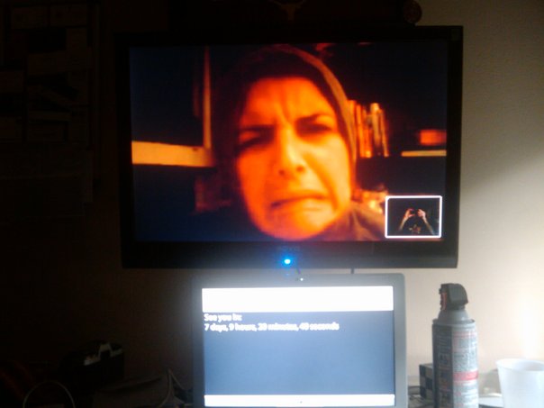 A woman posing as crying in a LCD tv and below are cleaning solutions and a glass
