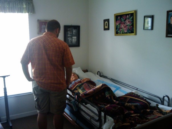 a young son is visiting his old grandmother who is lying sick in the hospital