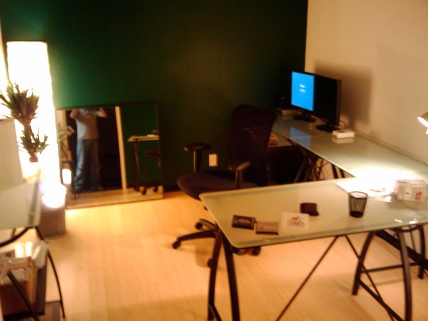 A cluttered table and black office chair sits in front of a very green wall and a mirror showing the photographer's body.