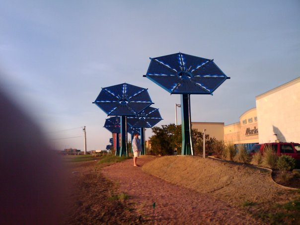 There are six large blue objects that look like satellite receivers, with a man standing near them.