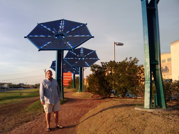The man is standing under the dish in the noon time
