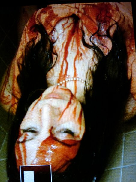 This picture depicts a young woman covered in blood, she is wearing a pearl necklace.