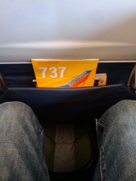 A man with blue jeans pant is siting in a car or flight. And there is an yellow book with the label 737