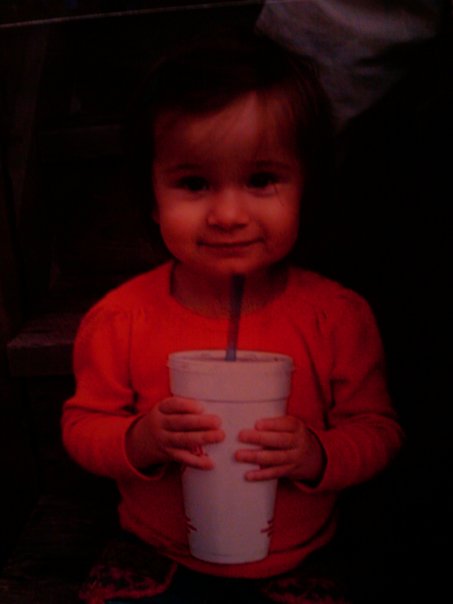 A cute little girl is holding a drink that is way too big for her!