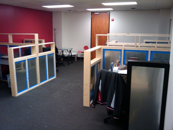 A cubicle office environment where the cubicles are constructed from pale wood, glass and blue frames.