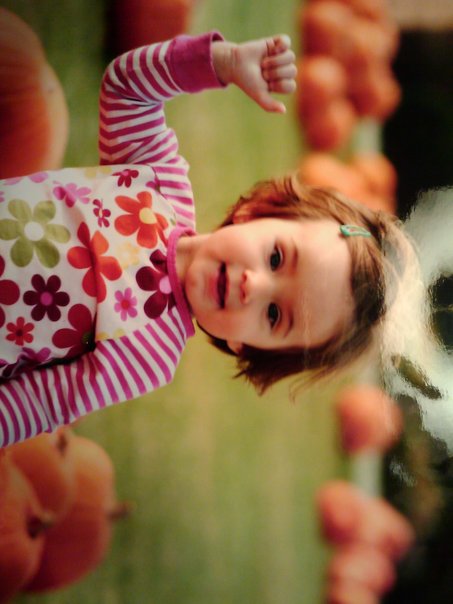 The little girl is wearing bright-colored clothing and playing in a pumpkin patch.