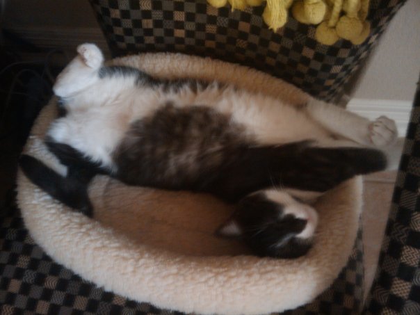 There is a big black and white cat is sleeping in a cushion.