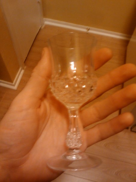 One man displaying a glass in this photo on his hand ,wine glass is very attractive.