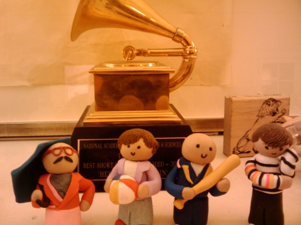 four stuffed dolls in the shape of human beings standing in front of a gold musical statue