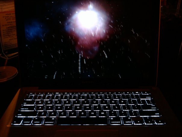 Picture of fireworks on a MacBook in a dark room, with back lit keys on the computer.
