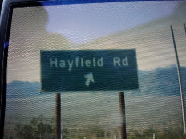 A green road sign with an arrow pointing towards Hayfield Rd.