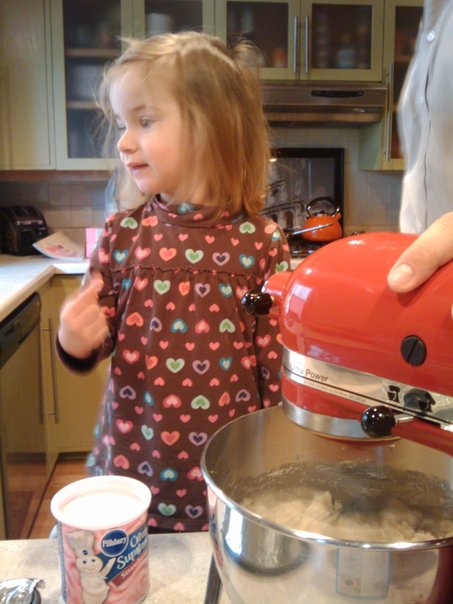 A toddler with reddish hair, and a dress festooned with hearts, helps mix cake batter.