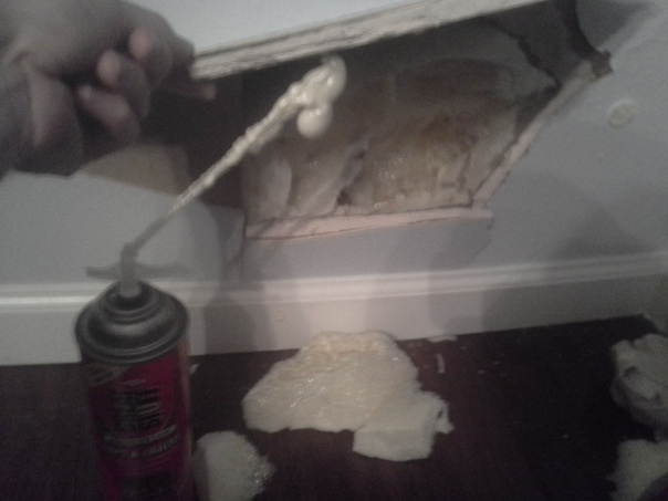 A workers hand can be seen applying crack repair foam to a piece of sheetrock. |