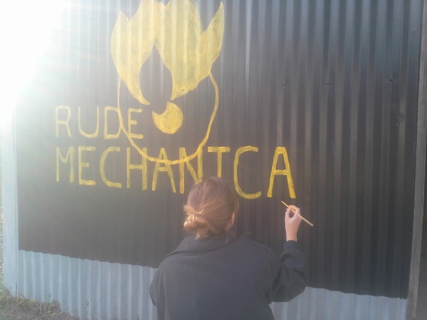 A woman is painting a yellow and black mural that says "Rude Mechantca" on a metal wall. |