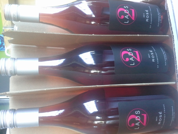 A carton of Lads 2 Rose cabernet franc from 2011 with silver wrappers around the cork and black labels. |