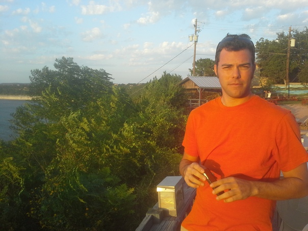a man in an orange shirt is holding his cell phone in his hands and is taking a picture while squinting because the sun is in his eyes |