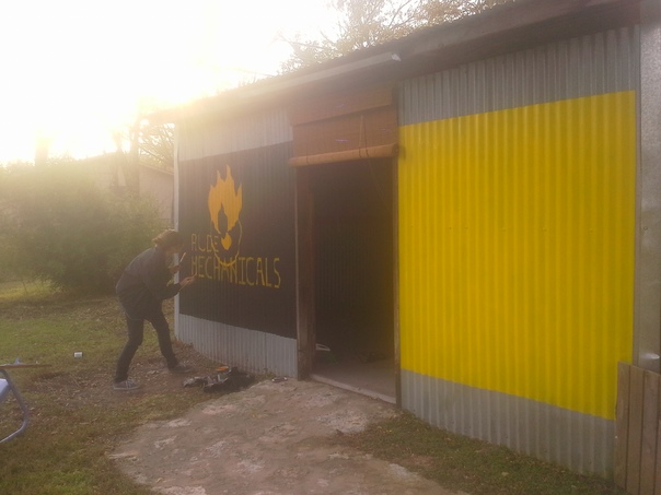 An artist puts the finishing touches on a sign painted on the side of a building. |