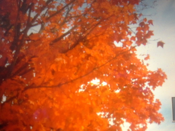 The sun shining through brightly colored orange leaves on a tree in the fall. |