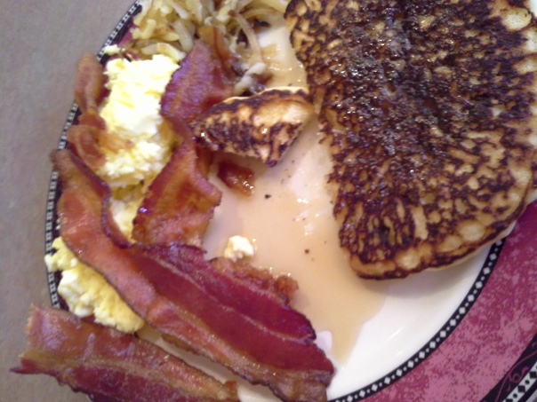 Breakfast foods, including bacon, eggs, and hash browns, are partially eaten on a plate. |