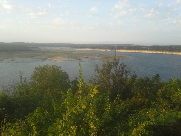Here we are up on a hill surrounded by green foliage looking down at a river cutting through the land on a clear sunny day. |