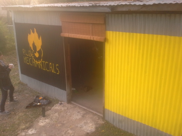 Here stands a building made of tin siding colored yellow with a sign that reads, "Rude Mechanical" with black background. |