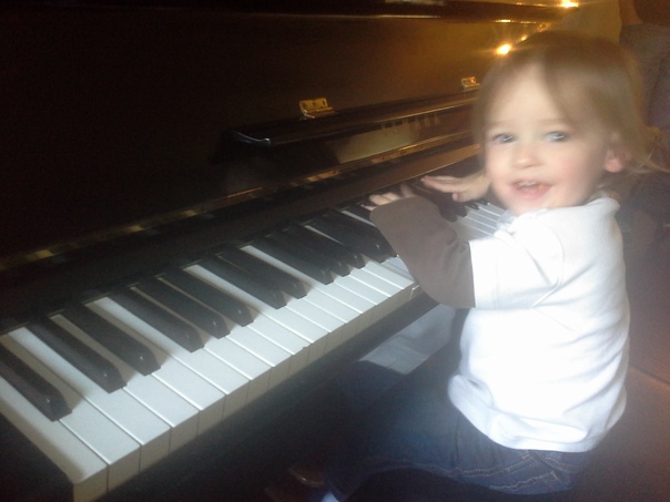 there is a little boy sitting on a piano chair smiling back at the camera and pretending to play the piano |