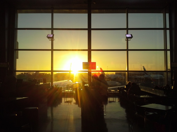 This picture was taken at an airport during sunset showing people and the airplanes outside. |