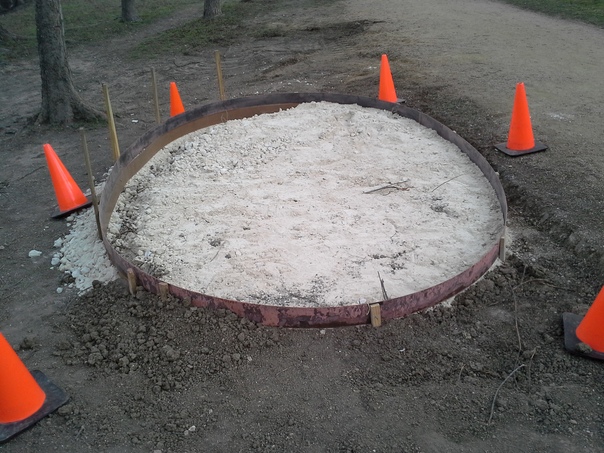 A fire pit filled with ash sits on a dirt covered ground and is surrounded by several orange pylons. |