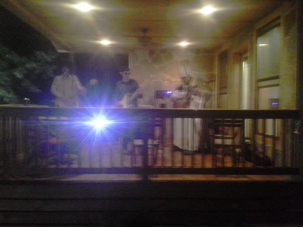 This is a picture of a band playing outside on the porch. |